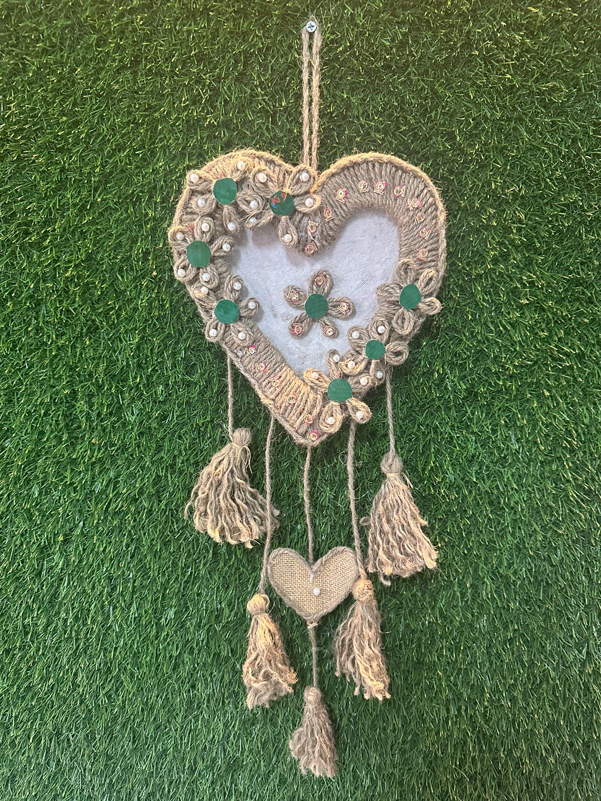 Decorate your walls with our charming heart shaped jute wall hanging. Handcrafted with natural fibers, its complex design adds warmth and texture for any room. This piece radiates love and style. Made from durable high quality jute. Ideal for gifting to express their love and affection.